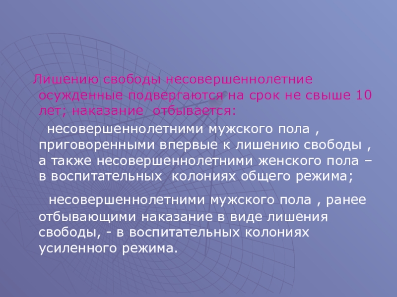 Лишению свободы несовершеннолетние осужденные подвергаются на срок не свыше 10 лет; наказание отбывается:   несовершеннолетними