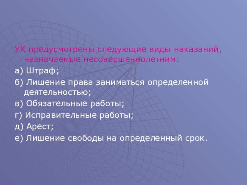 УК предусмотрены следующие виды наказаний, назначаемые несовершеннолетним:а) Штраф;б) Лишение права заниматься определенной деятельностью;в) Обязательные работы;г) Исправительные работы;д)