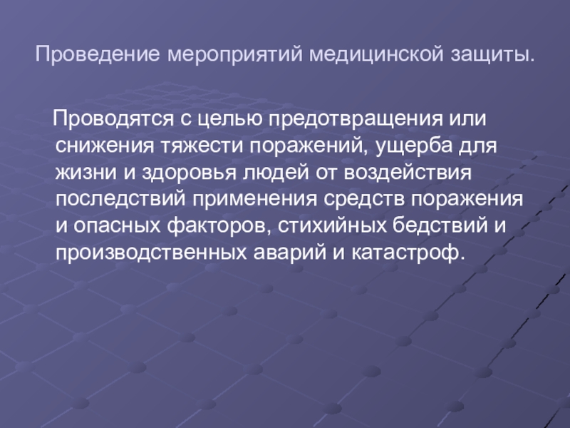 Проведение мероприятий медицинской защиты.  Проводятся с целью предотвращения или снижения тяжести поражений, ущерба для жизни и