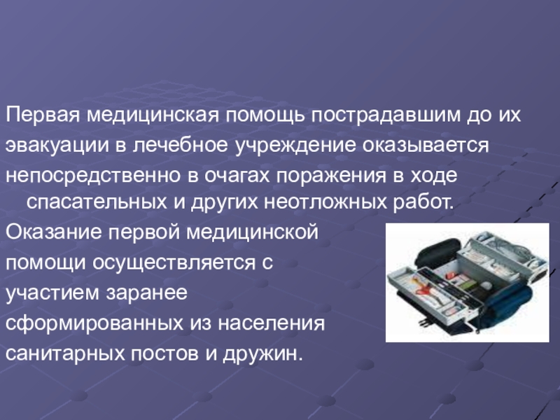Слайд 8Первая медицинская помощь пострадавшим до их