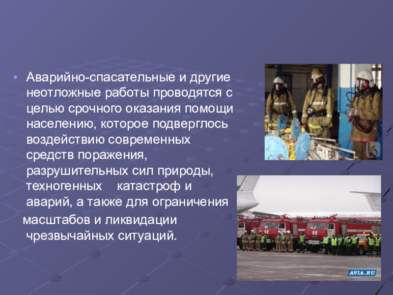 Слайд 2Аварийно-спасательные и другие неотложные работы проводятся с целью срочного оказания помощи