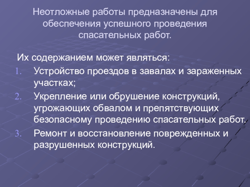 Неотложные работы предназначены для обеспечения успешного проведения спасательных работ.Их содержанием может являться:Устройство проездов в завалах и зараженных