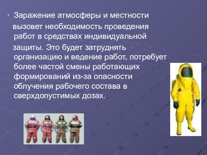Заражение атмосферы и местности  вызовет необходимость проведения работ в средствах индивидуальной  защиты. Это будет затруднять