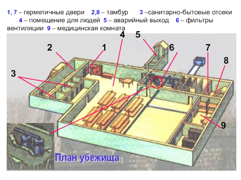 1, 7 – герметичные двери 2,8 – тамбур 3 –санитарно-бытовые отсеки 4 – помещение для людей 5 – аварийный выход 6 – фильтры вентиляции 9 – медицинская комната
