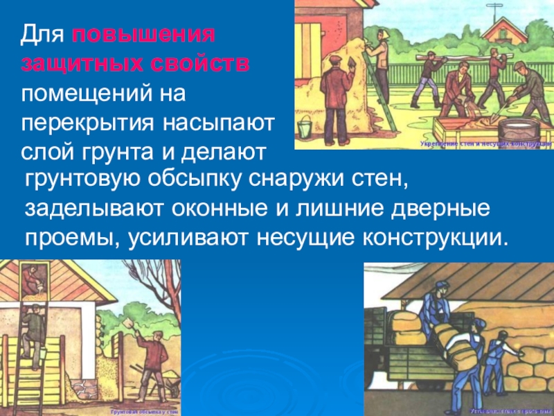 грунтовую обсыпку снаружи стен, заделывают оконные и лишние дверные проемы, усиливают несущие конструкции.