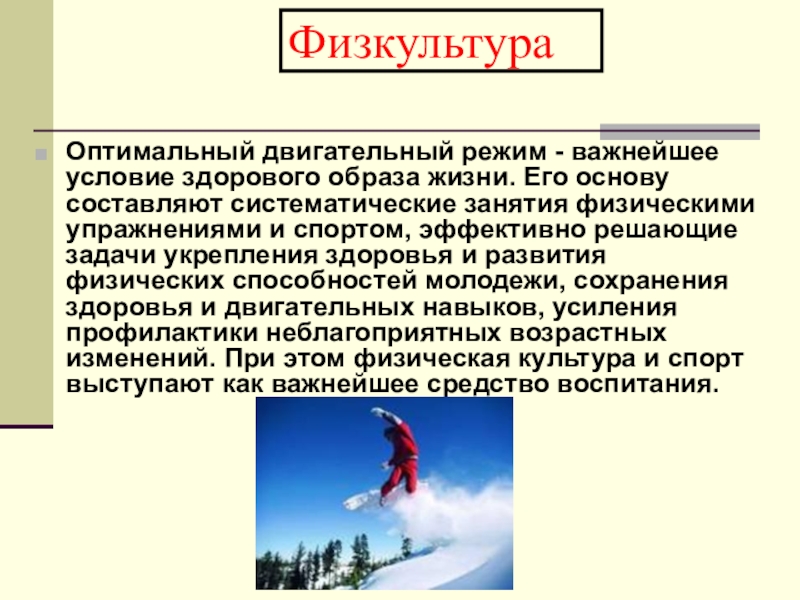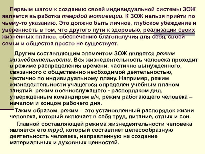 Другим составляющим элементом ЗОЖ является режим жизнедеятельности. Вся жизнедеятельность человека проходит в режиме распределения времени, частично вынужденного, связанного с общественно необходимой деятельностью, частично по индивидуальному плану. Например, режим жизнедеятельности учащегося определен учебным планом занятий, режим военнослужащего - распорядком дня, утвержденным командиром в/ч, режим работающего человека – началом и концом рабочего дня.