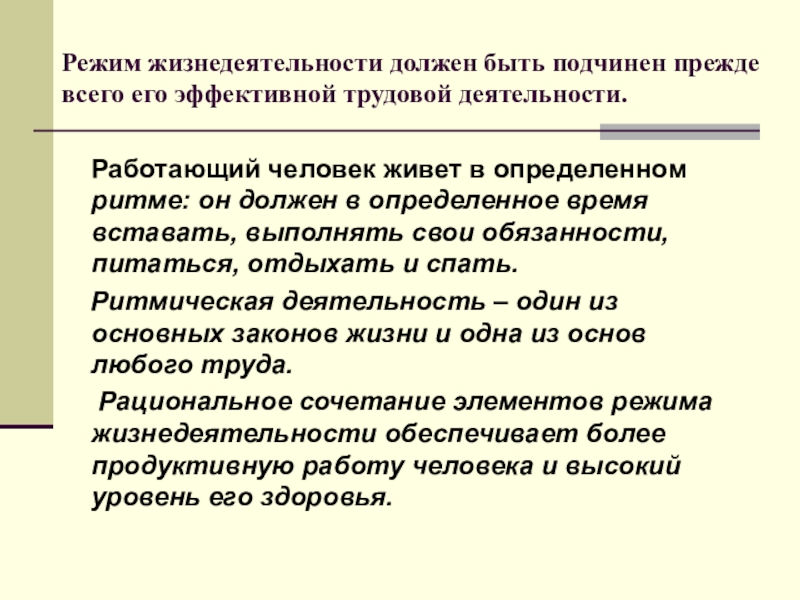 Главной составляющей режима жизнедеятельности человека является его труд, который составляет целесообразную деятельность человека, направленную на создание материальных и духовных ценностей.
