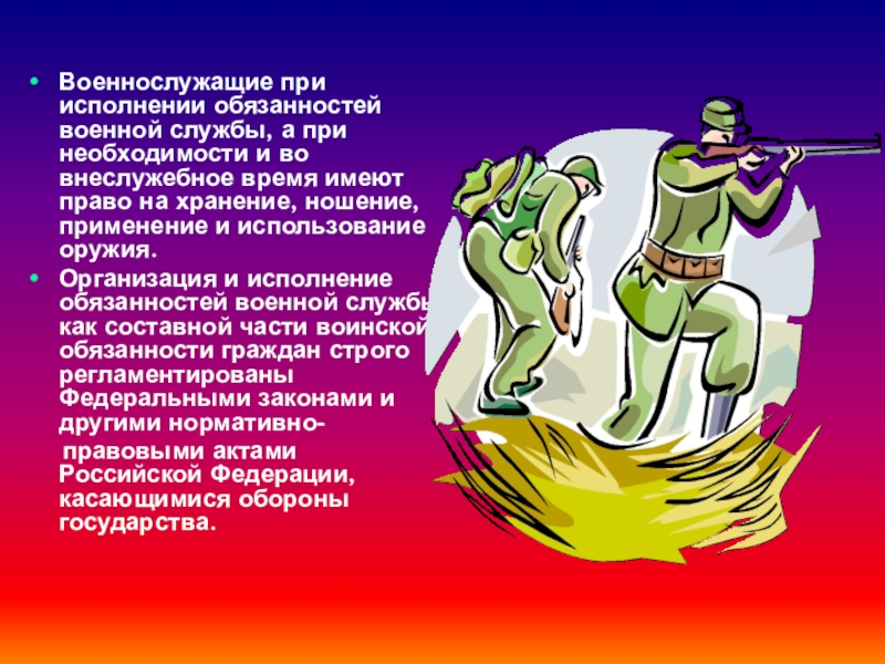 Слайд 6Военнослужащие при исполнении обязанностей военной службы, а при необходимости и во