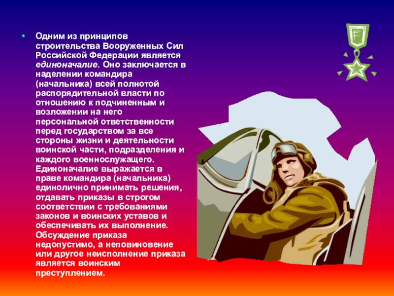 Слайд 5Одним из принципов строительства Вооруженных Сил Российской Федерации является единоначалие. Оно