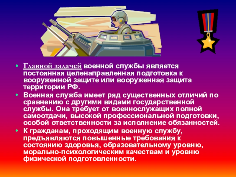 Главной задачей военной службы является постоянная целенаправленная подготовка к вооруженной защите