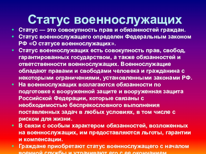 Статус военнослужащих есть совокупность прав, свобод, гарантированных государством, а также обязанностей и ответственности военнослужащих. Военнослужащие обладают правами и свободами человека и гражданина с некоторыми ограничениями, установленными законами РФ.
