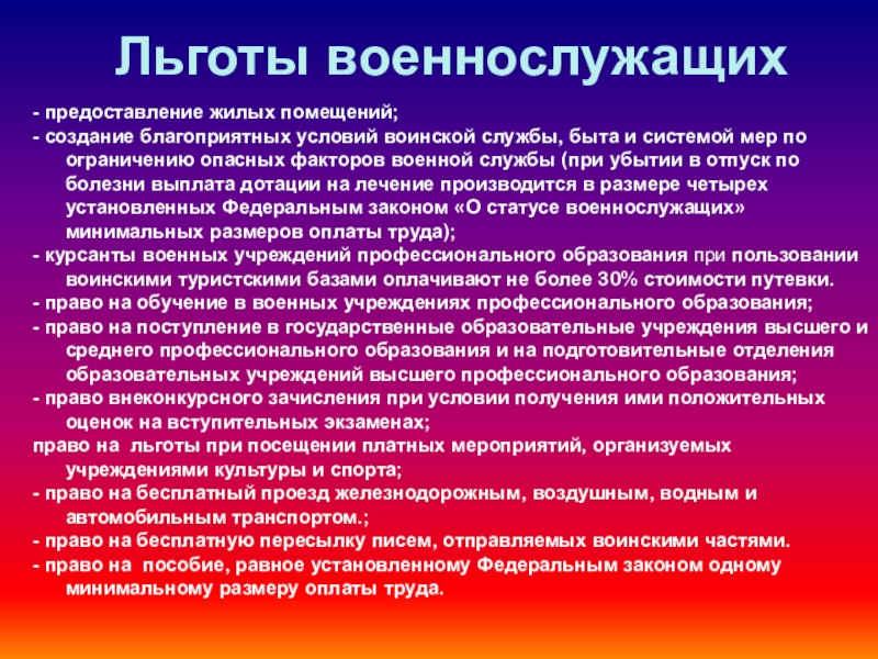 В связи с особым характером обязанностей, возложенных на военнослужащих, им предоставляются льготы, гарантии и компенсации.