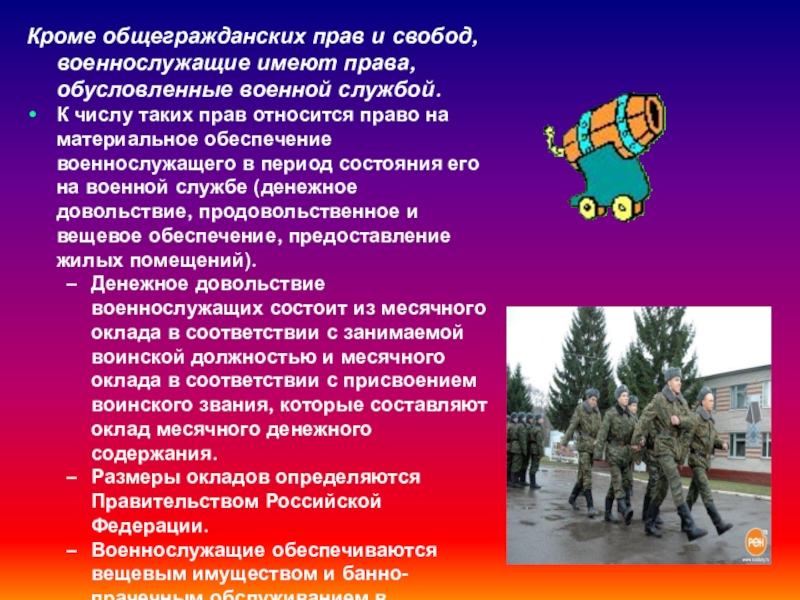 Слайд 12Кроме общегражданских прав и свобод, военнослужащие имеют права, обусловленные военной службой.