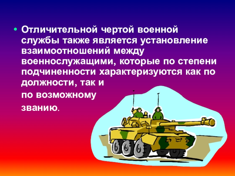 Слайд 4Отличительной чертой военной службы также является установление взаимоотношений между военнослужащими, которые