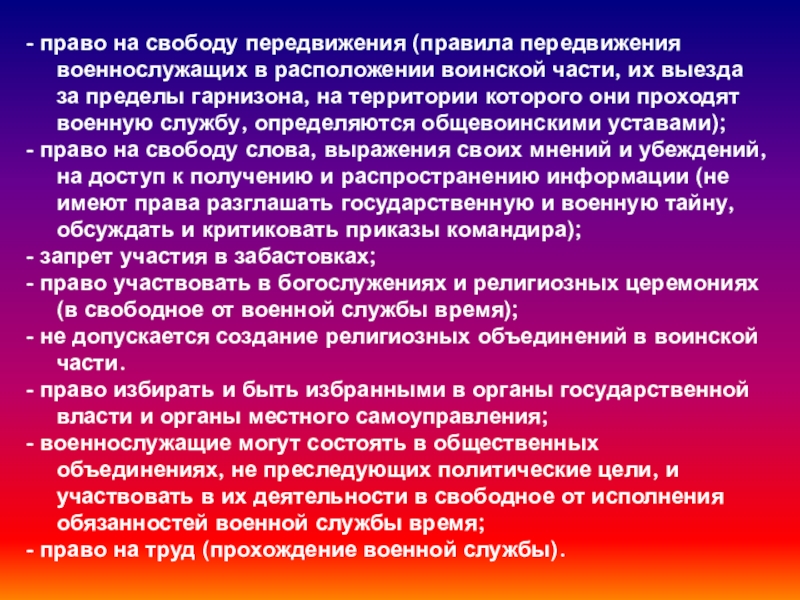Слайд 10- право на свободу передвижения (правила передвижения военнослужащих в расположении воинской
