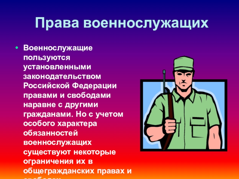 Военнослужащие пользуются установленными законодательством Российской Федерации правами и свободами наравне