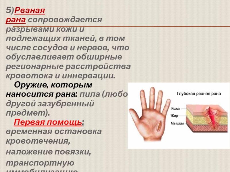Слайд 105)Рваная рана сопровождается разрывами кожи и подлежащих тканей, в том числе сосудов