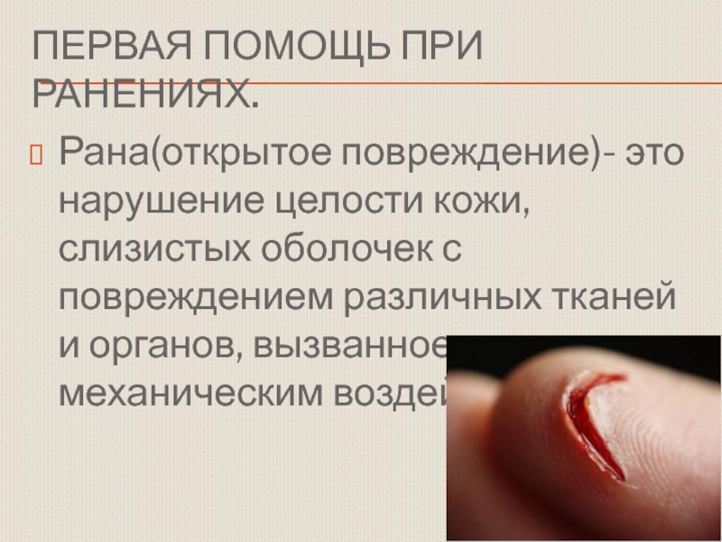 Рана(открытое повреждение)- это нарушение целости кожи, слизистых оболочек