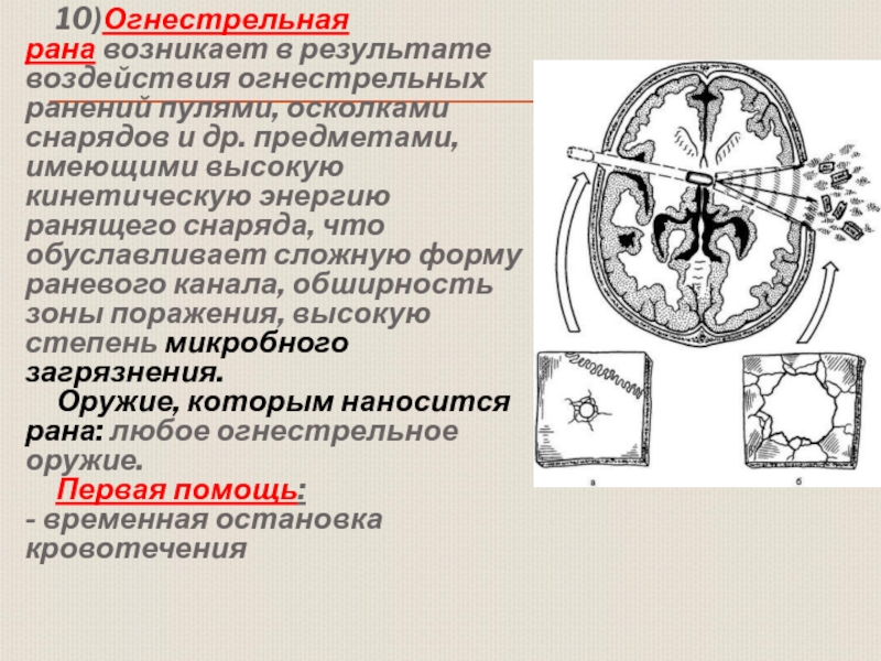 Слайд 14 10)Огнестрельная рана возникает в результате воздействия огнестрельных ранений пулями, осколками снарядов и