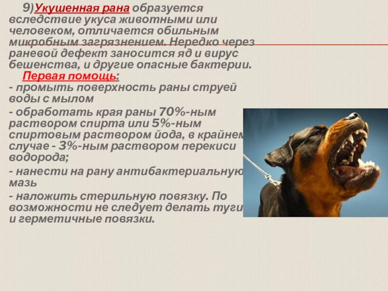 Слайд 13 9)Укушенная рана образуется вследствие укуса животными или человеком, отличается обильным микробным загрязнением.