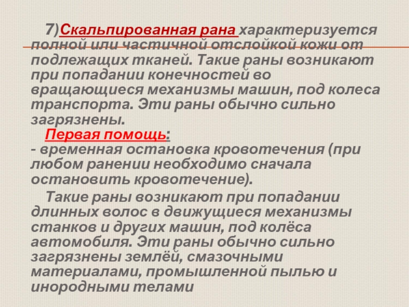 Слайд 11 7)Скальпированная рана характеризуется полной или частичной отслойкой кожи от подлежащих тканей.