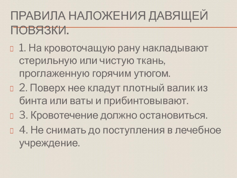 Слайд 26ПРАВИЛА НАЛОЖЕНИЯ ДАВЯЩЕЙ ПОВЯЗКИ.