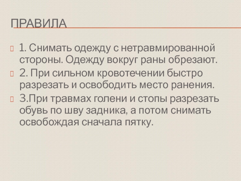 1. Снимать одежду с нетравмированной стороны. Одежду вокруг раны обрезают.