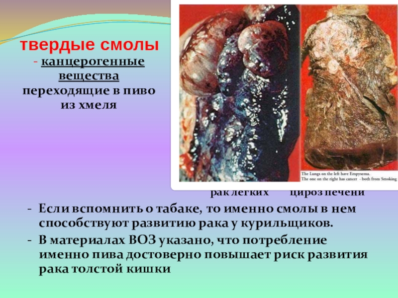 - Если вспомнить о табаке, то именно смолы в нем способствуют развитию рака у курильщиков.