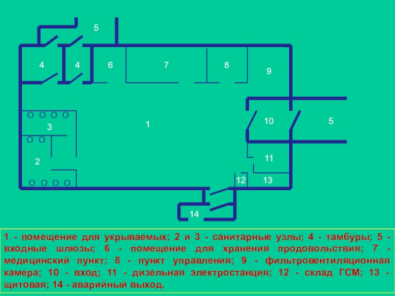 укрываемых; 2 и 3 - санитарные узлы; 4 - тамбуры; 5 - входные шлюзы; 6 - помещение для хранения продовольствия; 7 - медицинский пункт; 8 - пункт управления; 9 - фильтровентиляционная камера; 10 - вход; 11 - дизельная электростанция; 12 - склад ГСМ; 13 - щитовая; 14 - аварийный выход.