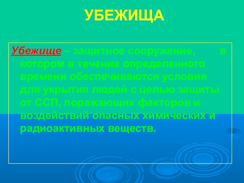 УБЕЖИЩАУбежище – защитное сооружение,    в котором в течение определенного времени обеспечиваются условия для укрытия