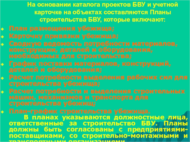 В планах указываются должностные лица, ответственные за строительство БВУ. Планы должны быть согласованы с предприятиями-поставщиками, со строительно-монтажными и транспортными организациями.