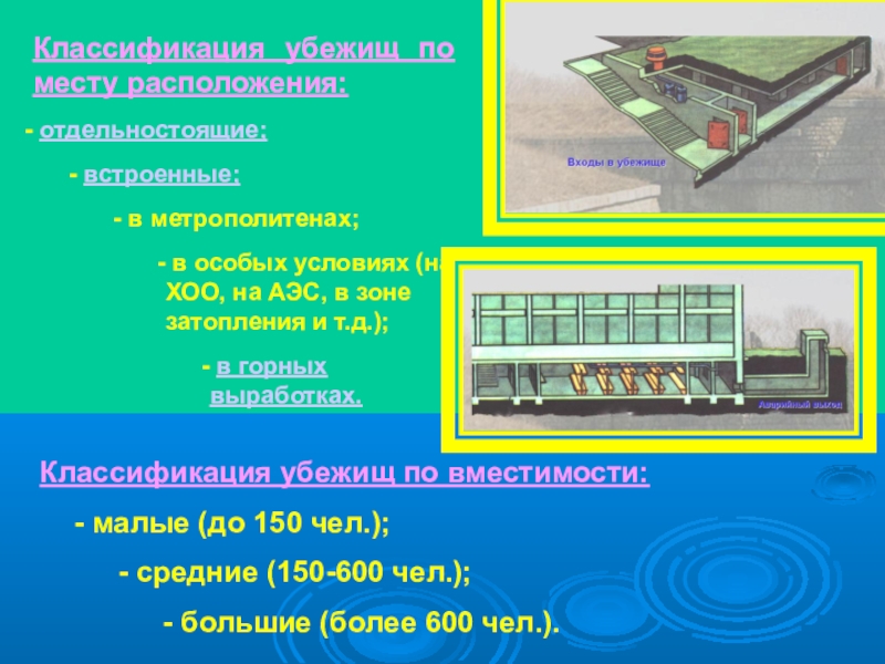 Классификация убежищ по месту расположения: отдельностоящие; встроенные; в метрополитенах; в особых условиях (на ХОО, на АЭС, в