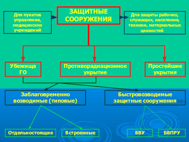 ЗАЩИТНЫЕ СООРУЖЕНИЯПротиворадиационное укрытиеУбежища ГОПростейшие укрытияДля пунктов управления, медицинских учрежденийДля защиты рабочих, служащих, населения, техники, материальных