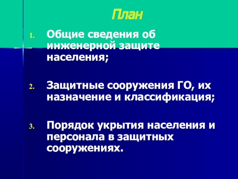 ПланОбщие сведения об инженерной защите населения;Защитные сооружения ГО, их назначение и классификация;Порядок укрытия населения и персонала в защитных сооружениях.