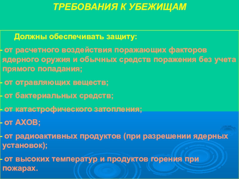 ТРЕБОВАНИЯ К УБЕЖИЩАМ	Должны обеспечивать защиту: от расчетного воздействия поражающих факторов ядерного оружия и обычных средств поражения без