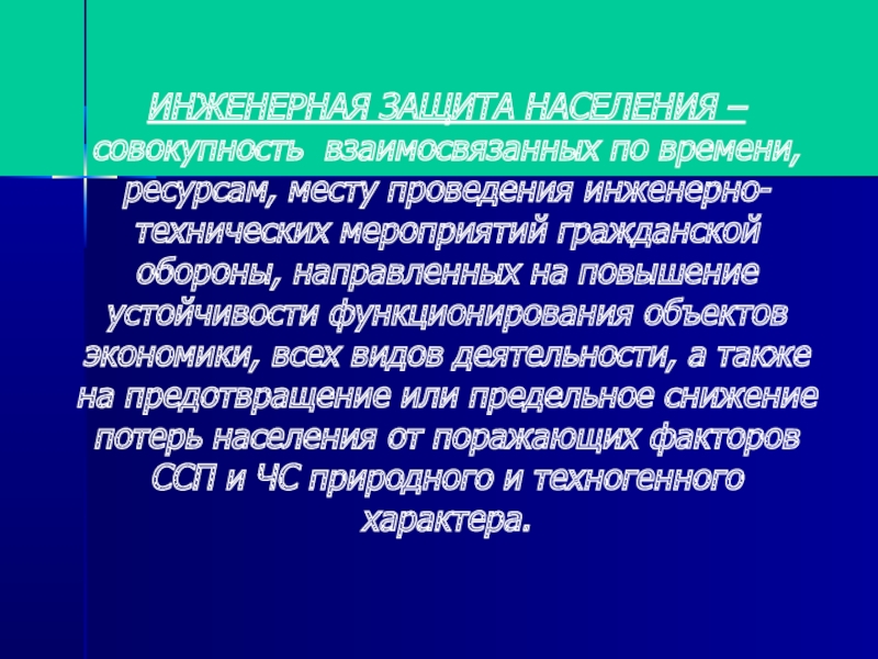 Слайд 4ИНЖЕНЕРНАЯ ЗАЩИТА НАСЕЛЕНИЯ – совокупность взаимосвязанных по времени, ресурсам, месту проведения