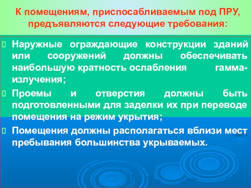 Слайд 18К помещениям, приспосабливаемым под ПРУ, предъявляются следующие требования: