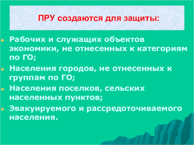 ПРУ создаются для защиты:Рабочих и служащих объектов экономики, не отнесенных к категориям по ГО;Населения городов, не отнесенных