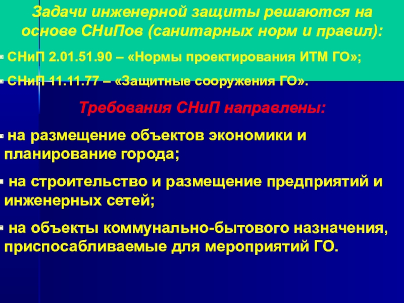 Задачи инженерной защиты решаются на основе СНиПов (санитарных норм и правил): СНиП 2.01.51.90 – «Нормы проектирования ИТМ