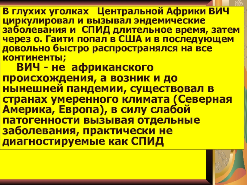 В глухих уголках   Центральной Африки ВИЧ циркулировал и вызывал эндемические заболевания и СПИД длительное время, затем через