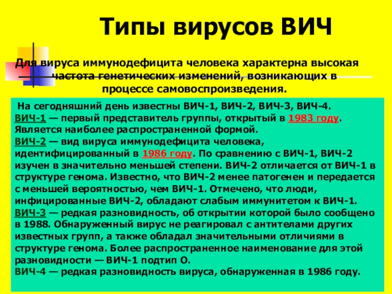 Типы вирусов ВИЧДля вируса иммунодефицита человека характерна высокая частота генетических изменений, возникающих в процессе самовоспроизведения. На сегодняшний