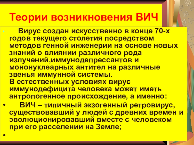 Теории возникновения ВИЧ   Вирус создан искусственно в конце 70-х годов текущего столетия посредством методов генной