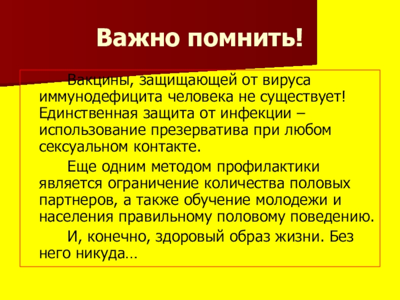 Важно помнить!     Вакцины, защищающей от вируса иммунодефицита человека не существует! Единственная защита от