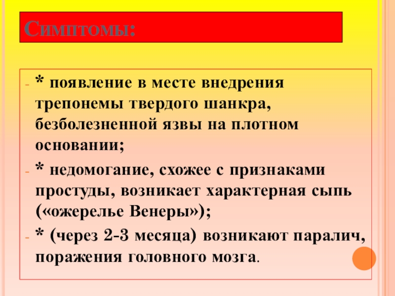 * появление в месте внедрения трепонемы твердого шанкра, безболезненной язвы