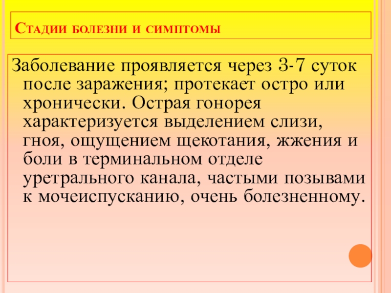 остро или хронически. Острая гонорея характеризуется выделением слизи, гноя, ощущением щекотания, жжения и боли в терминальном отделе уретрального канала, частыми позывами к мочеиспусканию, очень болезненному.