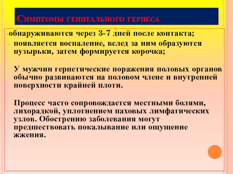 Процесс часто сопровождается местными болями, лихорадкой, уплотнением паховых лимфатических узлов. Обострению заболевания могут предшествовать покалывание или ощущение жжения.