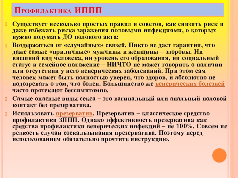 Использовать презерватив. Презерватив – классическое средство профилактики ЗППП. Однако эффективность презерватива как средства профилактики венерических инфекций – не 100%. Совсем не редкость случаи соскальзывания презерватива. Поэтому перед использованием обязательно прочтите инструкцию.