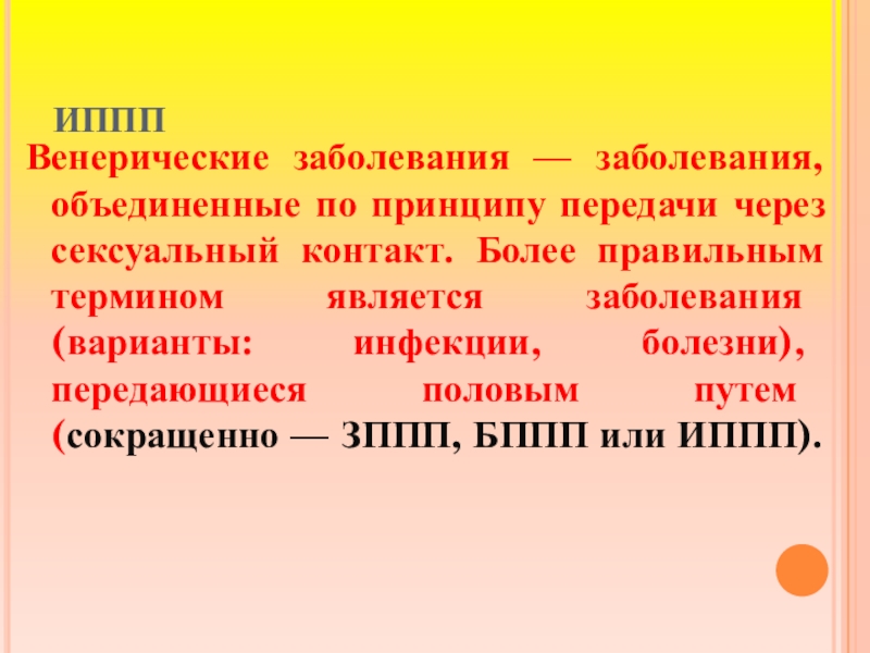 Более правильным термином является заболевания (варианты: инфекции, болезни), передающиеся половым путем (сокращенно — ЗППП, БППП или ИППП).