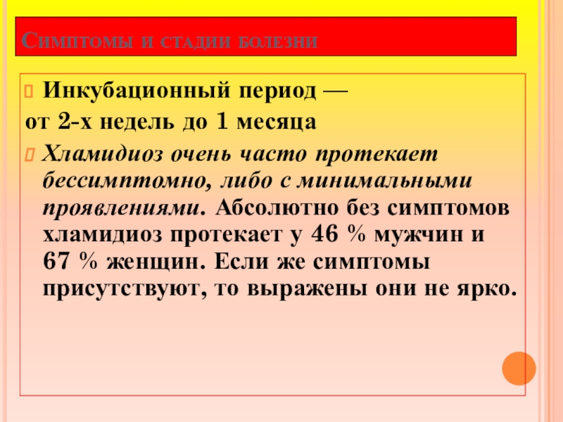 Хламидиоз очень часто протекает бессимптомно, либо с минимальными проявлениями. Абсолютно без симптомов хламидиоз протекает у 46 % мужчин и 67 % женщин. Если же симптомы присутствуют, то выражены они не ярко.