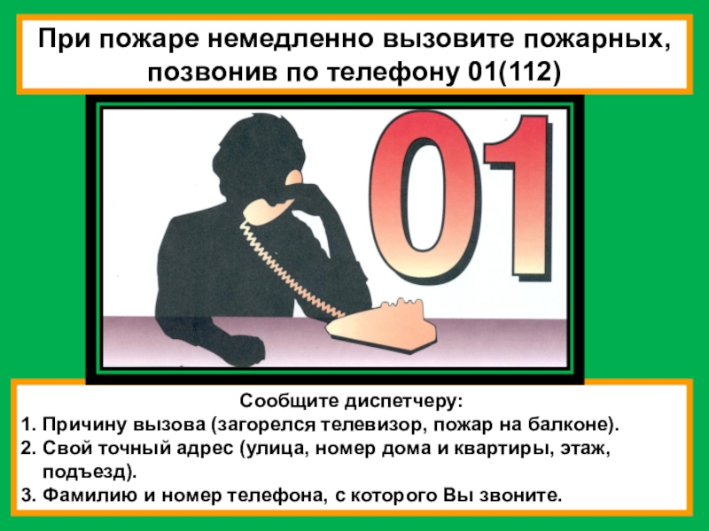 При пожаре немедленно вызовите пожарных, позвонив по телефону 01(112)